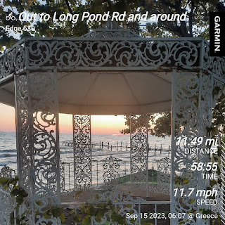 I didn't sleep well but I got up, got dressed and got out on my bike on my "Out to East Manitou Rd" route. There was a nice crescent moon and Venus in the eastern sky. I was 9 miles out before sunrise at 6:45 AM. I ran out of energy and slowed down on the way back. It was a nice ride though.